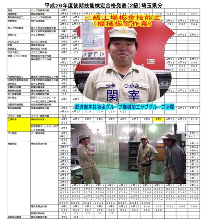 ■平成27年3月13日に平成26年度後期技能検定合格発表があり、弊社本社事業所所属の関宰(せきつかさ)の二級工場板金技能士(機会板金作業)の合格が発表されました。 弊社の工場板金技能士は現在、一級技能士1名(機械板金作業)、二級技能士3名(数値制御パーレットパンチプレス板金作業1名、機械板金作業2名)、基礎2級工場板金技能士(機械板金作業:技能実習生)6名となっております。